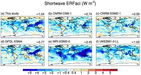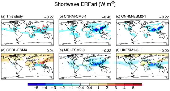 Comparison of annual mean shortwave effective radiative forcing of aerosol-radiation interactions in this study (a) and five available (b–f) Coupled Model Intercomparison Project phase 6 (CMIP6) model results.