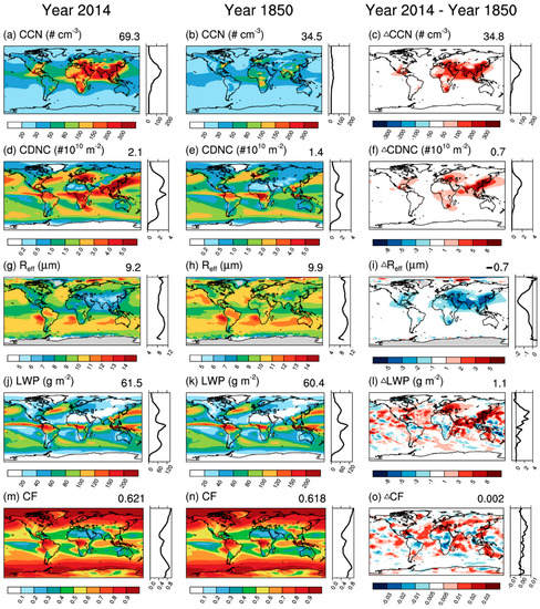 Figure 3 shows the comparison of the main cloud micro and macro physical properties for the year 2014 and year 1850. The aerosol particles, especially the hydrophilic particles (e.g., sulfate, OC, sea salt), can act as the cloud condensation nuclei (CCN) to impact the cloud properties. Therefore, we first show the surface CCN number concentration at a fixed supersaturation of 0.1% to look at how much CCN changes in the year 2014 relative to the year 1850, although we notice that it is not necessarily a very good indicator to reveal the relevant CCN number concentration in the real atmosphere []. The locations of the large increase in CCN number concentration (Figure 3c) are similar with the increase of the sulfate and carbonaceous AOD (Figure 1i). The global mean surface CCN number concentration is 69.3 cm−3, which is slightly lower than that of the result of 97.8 cm−3 from Liu et al. 2012 [] using the modal aerosol module (MAM7). The value of percentage increase is 101% (Figure 3c), which is close to the result of 115% from Grandey et al. 2018 [], although their value was taken from the level of 860 hPa. Figure 3d–f shows the distribution of the column-integrated cloud droplet number concentration (CDNC) for the year 2014, 1850, and the difference between the year 2014 and 1850. The spatial distributions of CDNC difference (Figure 3f) are similar to the pattern of AOD difference (Figure 1i), mainly due to the increase of sulfate and carbonaceous aerosol drive the increases of CDNC. The global mean cloud droplet effective radius at the cloud top above 273 K reduces from 9.9 μm to 9.2 μm (Figure 3g–i), which can be mainly attributed to the significant increases of CDNC when the cloud liquid water path (LWP) is assumed constant (i.e., Twomey effect), although the small increases exist in LWP (Figure 3l). Most of the decreased regions are located in the midlatitude of the Northern Hemisphere, especially in the regions emitting the anthropogenic aerosol heavily and their downwind direction. The weak increase of LWP (Figure 3l) is possibly caused by the decrease of precipitation rate (refers to the warm cloud precipitation, Figure S2, Supplementary Materials), which is related to the aerosol second indirect effect. Generally, an increase of the CDNC number concentration drives a decrease of precipitation rate, which are represented in the CAS-FGOALS-f3-L model using the Berry-type autoconversion scheme [,], although we note that the nonlinear CCN-precipitation mechanism may possibly more complicated in reality. In addition, cloud fraction (CF) has been shown to have a potentially large impact on the ERFaci, a small increase in CF (0.2%, Figure 3o), especially in the low CF (0.3%, Figure S3i) are found in our model.