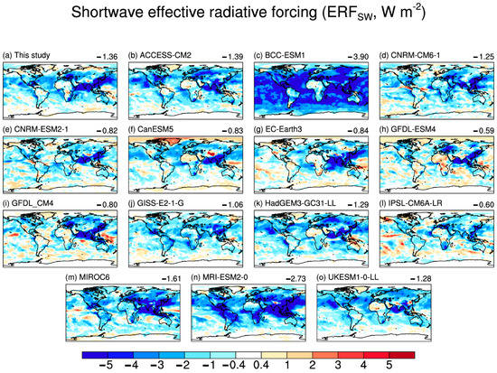 Comparison of annual mean shortwave effective radiative forcing in this study (a) and the 14 available (b–o) CMIP6 model results.