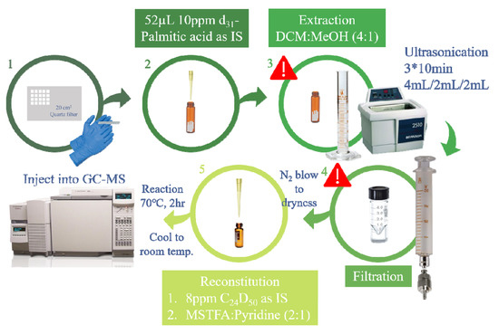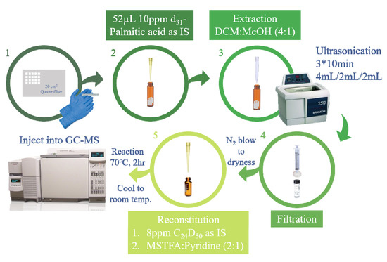 Our original method has been used for analyzing a wide range of polar organic compounds including sugar alcohols, aromatic acids, dicarboxylic acids as well as fatty acids that can be derivatized and subsequently amenable for Gas Chromatography-Mass Spectrometry (GC-MS) analysis [29,30,31]. This method saves time from performing individual experiments for different compound classes. Figure 1 shows the flowchart of sample pretreatment steps of this method. Briefly, during sample pretreatment, an aliquot of 20 cm2 exposed filter material was removed from the whole filter (20 × 25 cm) for extraction. Before adding extraction solvent, consisting of dichloromethane (DCM):methanol (4:1) (HPLC grade, Duksan, Ansan City, Gyeonggi Province, South Korea), 52 µL 10 ppm d31-palmitic acid in acetonitrile was spiked onto the filter as internal standard and the filter was set aside for the solvent to dry. The solution was then ultra-sonicated in water bath at room temperature three times, each lasting 10 min. The solvent volume used for each extraction was 4, 2, and 2 mL, respectively. After that, the solution was filtered through the plastic syringe (Terumo, Tokyo, Japan) and hydrophobic polytetrafluororethylene (PTFE) membrane 0.2 µm syringe filter disc that is housed in polypropylene (PP) material (Pall). The filtrate was blown to dryness using ultra-high pure nitrogen gas and reconstituted to 200 µL with a mixture of N-methyl-N-trimethylsilyl-trifluoroacetamide (MSTFA) derivatization agent (Meryer, Shanghai, China, 97%), pyridine (Sigma-Aldrich, St. Louis, MO, USA) as a catalyst and a second internal standard of 8 ppm d50-tetracosane (C24D50) (Sigma-Aldrich) in hexane, (2:1:1.14 v/v). The derivatization reaction is required to increase the volatility and thermal stability of the polar target analytes for GC detection. MSTFA targets polar compounds containing functional groups with active hydrogen atoms such as that in carboxylic group, hydroxyl group etc. After the derivatization reaction, the active hydrogens are replaced with trimethylsilyl groups. The final solution was allowed to react at 70 °C for 2 h. After cooling to room temperature, 1 µL of the sample was injected into a GC-MS system (Agilent 6890/5973N) for analysis. The GC-MS instrumental parameters were set as the following. The injector, operated in splitless mode, was set at 275 °C. Compounds were separated on a DB-5MS column (30 m × 0.25 mm × 0.25 μm, J&W Scientific, Folsom, CA, USA) using ultra high pure helium as the carrier gas at 1.2 mL/min. The GC oven temperature was initially set at 80 °C for 5 min, increased to 200 °C at 3 °C/min and held for 2 min, then to 310 °C at 10 °C/min and held for 25 min. The MS analysis was conducted in electron impact positive (EI+) scan mode over an m/z range of 50−650 amu. The ion source, quadrupole, and interface temperatures were kept at 230, 150, and 280 °C, respectively. The quantification ions for palmitic acid and stearic acid were m/z 313 and 341. Plastic pipette tips were used in steps 2, 3 and 5, as shown in Figure 1, for transferring different solutions. Calibration was completed with the same approach by first spiking d31-palmitic acid as the internal standard and mixed standard solutions on an aliquot of 20 cm2 prebaked (at 550 °C for 12 h) blank filter material, then following the whole procedure described above. The calibration had six calibration points ranging from 0 ppm to 5 ppm.