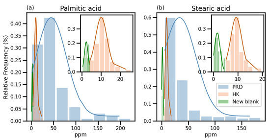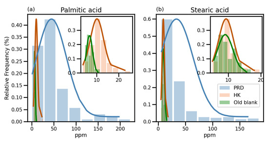 Contrast of concentrations of (a) palmitic acid and (b) stearic acid as measured by the revised new method and shown as relative frequency distribution histograms for method blanks (n = 21, marked in green color) and the ambient samples. The ambient samples (the Pearl River Delta (PRD) samples in sky blue color and the HK samples in cantaloupe brown color) are the same as those displayed in Figure 3. Insert plots are zoomed-in images of the histograms of field blanks and the HK samples. The solid lines denote the normal distributions of the corresponding data.