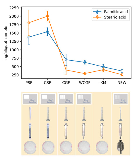 The comparison results indicate that the significant source of fatty acid contamination was associated with the plastic syringe as its contamination dropped by 2–5 times once it was replaced (i.e., a glass measuring cylinder and a glass syringe and plastic filter cassette combination (CGF) vs. pipette, syringe and filter cassette (all plastic) used in the original method (PSF) in Figure 4). The reduction was more obvious for stearic acid as the contamination has decreased by over 1600 (±12%) ng/aliquot sample (20 cm2). For palmitic acid, the contamination has decreased by over 800 (±25%) ng/aliquot sample (i.e., from a glass measuring cylinder, plastic syringe, and plastic filter cassette combination (CSF) to CGF). It indicates that the plastic syringe fortified more stearic acid than palmitic acid.