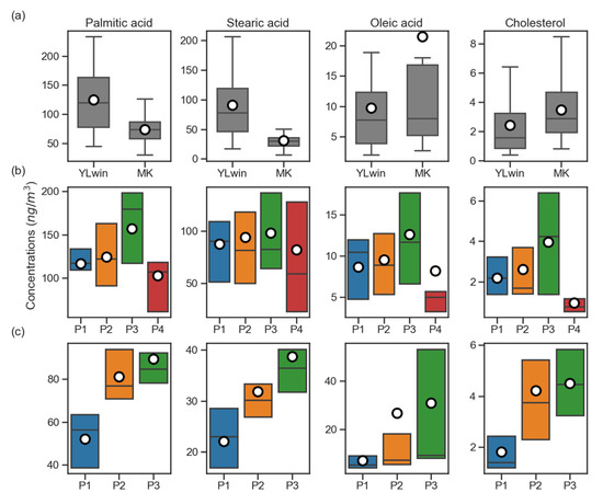 (a) Abundance of fatty acids and cholesterol in ng/m3 at Yuen Long (YL) and Mong Kok (MK) sites. (b) YL site: diurnal variations of fatty acids and cholesterol as seen through the time-segments of P1 to P4, namely 06:00–11:00 (P1), 11:00–16:00 (P2), 16:00–21:00 (P3) and 21:00–06:00 (P4). (c) MK site: diurnal variations of the same set of organic tracers as seen through the time-segments of P1 to P3 (no sampling during P4 at this site). The lower bound of the box denote the 25th percentile and the upper bound denote the 75th percentile. The solid lines represent the medians and the white dots with black edge represent the averages.