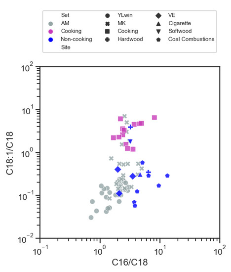 Ratio–ratio plots of C18:1/C18:0 against C16:0/C18:0 color coded or marked by different settings. Ambient samples (AM) are marked in grey, cooking source data in pink, and non-cooking source data in blue. VE means vehicular emissions. Cigarette, hardwood and softwood mean the combustion emissions using them as fuel.