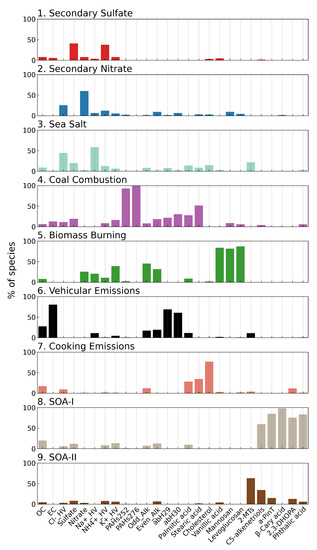 Eight to ten factors were tested, and the nine-factor solution was determined to be the most suitable in terms of interpretation and robustness. To reduce rotational ambiguity and give a more reasonable profile, several constrained were set and listed in Table S1. The PMF base run without constrains was unable to clearly separate cooking and vehicular emissions (Figure S2), and the details describing the base run are provided in the Supplementary Materials. The source profiles of the constrained nine-factor solution are shown in Figure 8. Factor identification was based on the highest loading species, and their indicative sources are summarized in Table S1. Five primary sources were resolved, namely sea salt aerosol by Na+ and Cl−, coal combustion by PAHs252 and PAHs276, biomass burning by levoglucosan, mannosan, and vanillic acid, vehicular emissions by hopanes and EC, and cooking emissions by cholesterol, palmitic acid, and stearic acid. Four secondary sources were resolved, including secondary sulfate process, secondary nitrate process [31], and two SOA factors. SOA-I factor is associated with high loadings of SOA tracers derived from volatile organic compound precursors including α-pinene, β-caryophyllene, mono-aromatic compounds, and naphthalene and derivatives. SOA-II is associated with SOA tracers derived from oxidation of isoprene. In the PMF-resolved source profiles, while cholesterol is mainly (77%) loaded in the cooking factor, palmitic acid and stearic acid are comparably distributed in coal combustion and cooking factors. These results are consistent with the qualitative source origin information reported in Section 3.4.1.