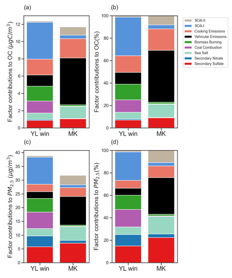 The resolved average factor contributions to PM2.5 and OC for each site are shown in Figure 9 in both mass contributions (Figure 9a,c) and in percent contributions (Figure 9b,d). We note that the two groups of samples were collected in different seasons, with the YL samples collected in winter 2016 and the MK samples collected in summer 2017, and the seasonal contrast is known to be prominent for Hong Kong, with regional/super regional sources dominant over local sources in wintertime [43,44,45]. This seasonal difference is clearly reflected in the significant higher contribution of coal combustion and biomass burning at YL than at MK (i.e., 1.39 vs. 0.04 and 1.72 vs. 0.16 µgC/m3, respectively). SOA-I, dominated by SOA resulting from precursors including toluene and other mono-aromatic compounds and naphthalene and derivatives, was significantly higher in winter YL than in summer HK (4.26 vs. 0.43 µgC/m3). SOA-II, dominated by isoprene SOA, showed the opposite result, lower in winter YL while higher in summer MK (0.15 vs. 0.95 µgC/m3). Such seemingly inconsistent results are actually consistent with the seasonality of pollution characteristics and isoprene emissions. The precursors of SOA-I were significantly enhanced due to contributions of regional/super-regional sources, therefore more SOA-I was in the winter YL samples. On the other hand, isoprene emissions are driven by temperature and known to be significantly higher in summer, and this explains the higher SOA-II in the summer MK samples.