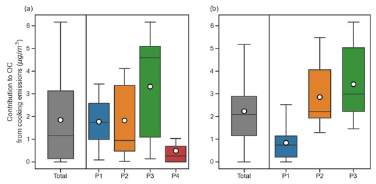 Examining the cooking contributions by time segments (Figure 10), we clearly see a diurnal variation, with the highest contributions occurring during P3 (16:00–21:00) at both sites in coincidence with main dinner hours. At MK site, contribution in P2 (11:00–16:00) covering the main lunchtime hours was also high. This result was consistent with the PMF result from AMS measurements [7]—that they observed peaks of cooking OA from 12 noon to 2 p.m. and from 7 p.m. to 9 p.m.. However, in YL winter, contribution from P2 was only comparable to P1 (06:00–11:00). At MK site, the restaurants nearby are mostly not open in the morning and the meals served at breakfast often require a less oily cooking style leading to generally lower emissions [7]. At YL site, there are restaurants that serve breakfast in the vicinity of the sampling site, explaining the comparable contribution between P1 and P2.
