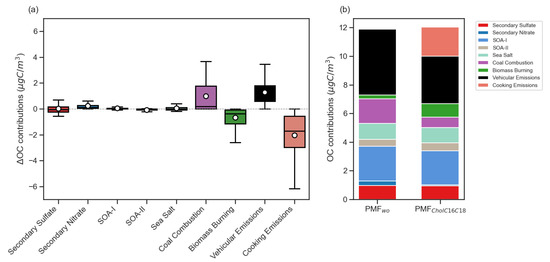 (a) Boxplot of modeled OC contribution differences (PMFwo–PMFCholC16C18) (µg/m3) for individual factors. (b) Modeled OC contributions (µg/m3) from PMFwo and PMFCholC16C18.