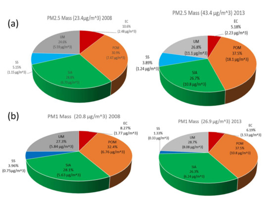 Differentiation of (a) the PM2.5 and (b) the PM1 mass closure profile in March 2008 and 2013.