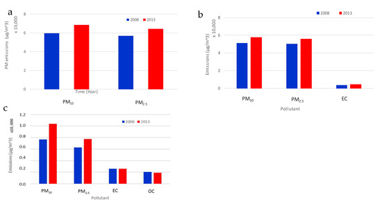 Differentiation of the average (a) total, (b) residential heating and (c) traffic PM10 and PM2.5 emissions between the March of 2008 and 2013.