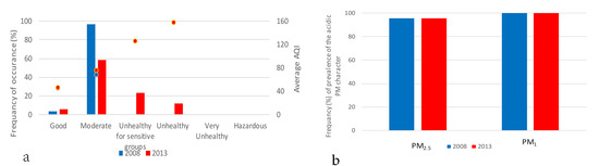 Frequency of occurrence (%) of (a) the health categories and the average AQI in connection with PM2.5 and (b) the prevalence of the acidic PM character during March of 2008 and 2013.