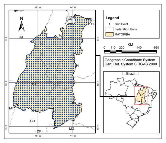 The meteorological data used in this study are daily incident solar radiation (Rs—MJ m−2 day1), rainfall (mm), maximum and minimum temperature (Tmax and Tmin—°C), relative air humidity (RH—%), and reference evapotranspiration (ETo—mm day1) covering the period from 1980 to 2013 and available in a 0.25° × 0.25° horizontal grid [55], encompassing a total of 963 points over the MATOPIBA region (Figure 1), available at the website <https://utexas.box.com/Xavier-etal-IJOC-DATA>. These data were used to define the climatological patterns of the region. We also used daily Tmax and Tmin (°C), rainfall (mm), and Rs (MJ m−2 day1) data to calibrate the CROPGRO-Soybean model of the Decision Support System for Agrotechnology Transfer (DSSAT), allowing the simulation of 33 sowing seasons.