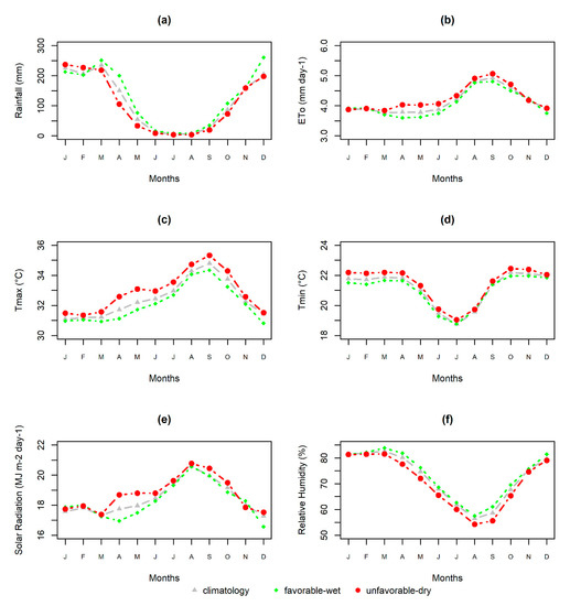 Mean monthly values of the meteorological variables in the period from 1980 to 2013 in the MATOPIBA region regarding the climatology, the favorable scenario (wet), and the unfavorable scenario (dry). (a) Rainfall, (b) ETo: Reference Evapotranspiration, (c) Tmax: Maximum Temperature, (d) Tmin: Minimum Temperature, (e) Solar Radiation and (f) Relative Humidity.