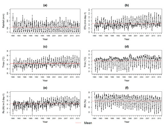Figure 2 shows the mean monthly values of Rs (MJ m−2 day−1), rainfall (mm), ETo (mm day−1), Tmax and Tmin (°C), and RH (%) from 1980 to 2013 for the MATOPIBA region, considering the climatology of the period, the favorable scenario (wet), and the unfavorable scenario (dry).