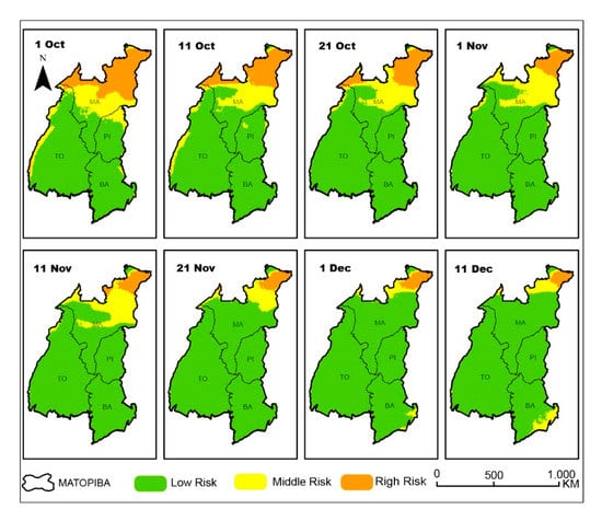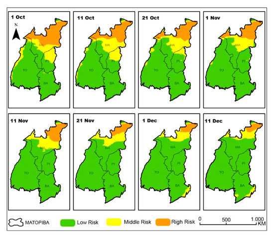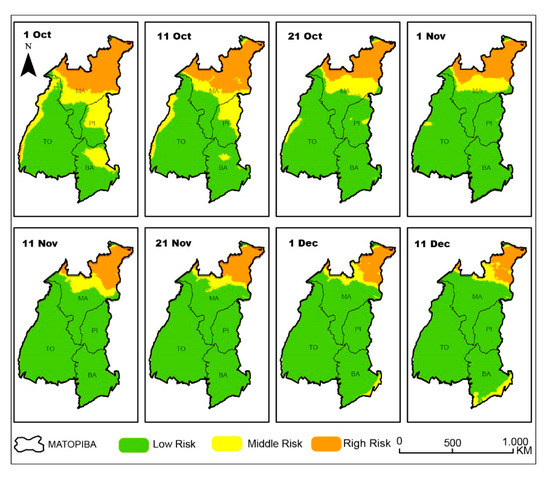 Similar to the climatology scenario, the medium- and high-risk areas were concentrated in the north of the region, regardless of the date of sowing, and in the southernmost portion of MATOPIBA when sowing is done late (December). It is worth noting that the unfavorable areas to the north reduce in extension in later sowing dates.