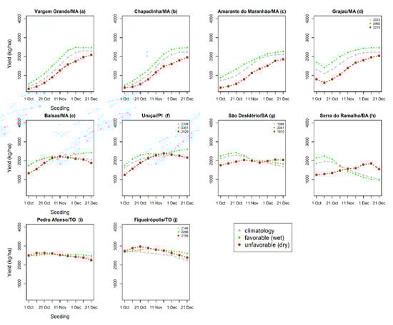 In general, results show that the mean achievable yields of simulated soybean during 33 cultivation seasons in nine sowing dates for the 10 locations distributed in the MATOPIBA region were similarly affected in the three analyzed meteorological conditions, presenting higher mean values in the favorable (wet) scenario and lower ones in the unfavorable (dry) scenarios (Figure 7). Considering the yield behavior in the nine sowing windows, four distinct patterns were observed among locations. The first encompasses the municipalities of Vargem Grande, Chapadinha, Amarante do Maranhão, and Grajaú, located in the state of Maranhão in the northern portion of the MATOPIBA region; the second comprises the municipalities of Balsas (MA) and Uruçuí (PI) covering the central-eastern part of MATOPIBA; the third encompasses areas of the municipalities of São Desidério and Serra do Ramalho, both in Bahia comprising the southeastern portion of the MATOPIBA region; and the fourth encompasses locations in the Pedro Afonso and Figueirópolis municipalities, both located in the state of Tocantins, comprising the central-western part of MATOPIBA. Among these groups, we noted that the highest yields were retrieved in the central-western portion of the MATOPIBA region, with an average of approximately 2800 kg ha−1, mainly for sowing carried out in late October and mid-November. Meanwhile, the lowest averages were retrieved in the northern part of the region, with mean values of approximately 1500 kg ha−1.