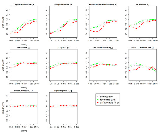 For much of the region, the exposure of soybeans to the risk caused by water deficit is minimized with the establishment of the wet season (late October to mid-November). These results are consistent with several studies [39,40,55,112,113,114,115] that demonstrated that the amount of rainfall is positively correlated with the WRSI, contributing to the reduction of yield loss due to the water deficit.