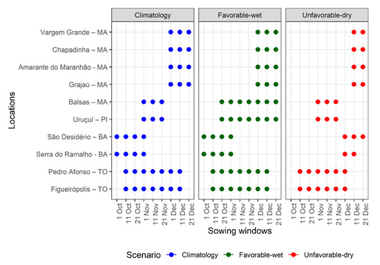 The simulated soybean yield was analyzed for 10 locations distributed among the 10 MATOPIBA mesoregions (Northern Maranhão, Central Maranhão, Eastern Maranhão, Western Maranhão, Southern Maranhão, Southwestern Piauí, Extreme-western Bahia, São Francisco Valley Bahia, Eastern Tocantins, and Western Tocantins) through the perspective of the three aforementioned meteorological scenarios. We deem that these 10 sample locations are enough to analyze the soybean yield behavior under the different environmental characteristics of the MATOPIBA region. The result of the simulated yield was used to determine the best sowing date, considering the three meteorological conditions, since the final yield comprises the influence of all soil and climatic factors on crop development. Thus, as a criterion for determining the best sowing period, the method described in reference [44] was used, where the appropriate sowing window takes place when the simulated yield for each crop-year is higher than the average yield (considering the 33 years of cultivation) in at least 60% of the years.