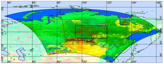 Geographical locations of the COSMO-Ru (COnsortium for Small-scale MOdeling; Ru—Russia) and COSMO-RuART (ART—Aerosols and Reactive Trace gases) modeling domains (contoured by black and red lines, respectively), as well as Study Area 1 and Area 2 (contoured by blue line) selected to analyze the possible effects of forest fires on weather conditions. Red spots are locations of forest fires within the modeling domains for selected period of 1–14 August 2019. The background color depicts surface elevation.