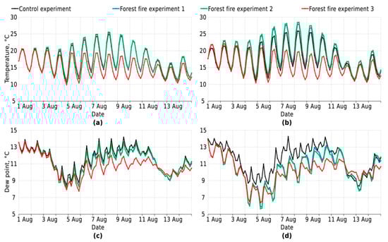 Temporal variability of air temperature and dew point for Area 1 from 1–14 August 2019 under various forest fire experiments: (a) mean air temperature (2 m height) for the entire area, °C; (b) mean air temperature at the burned sites, °C; (c) mean dew point (2 m height) for the entire area, °C; (d) mean dew point at burned sites, °C.