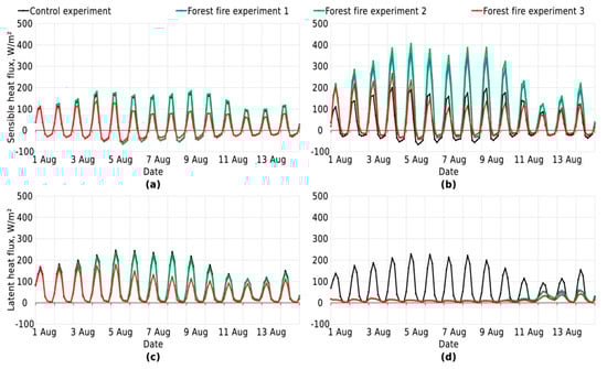 Temporal variability of energy fluxes for Area 1 from 1–14 August 2019 for various forest fire experiments: (a) sensible heat fluxes averaged over the entire area, W/m2; (b) mean sensible heat fluxes at burned sites, W/m2; (c) latent heat fluxes averaged over the entire area, W/m2; (d) mean latent heat fluxes at burned sites, W/m2.