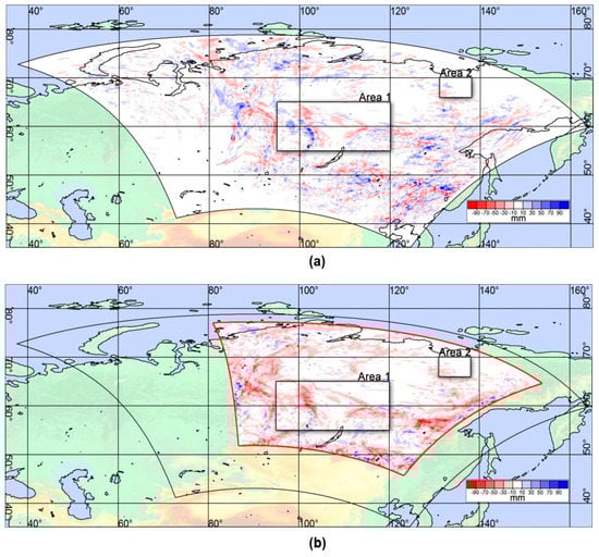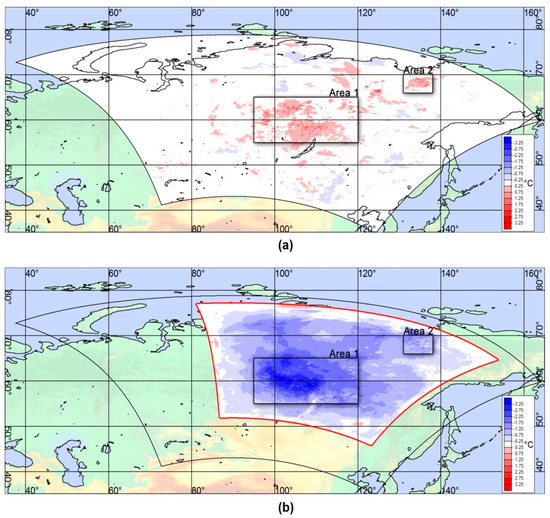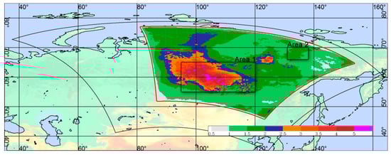 According to the Köppen–Geiger climate classification system [47,48], Area 1 has subarctic climate (Dfc) with long and usually very cold winters with short mild summers. Area 2 is situated in the north-eastern part of the modeling domain and it is characterized by extremely cold subarctic climates (Dfd, Dwd) with severe winters and very short cool to mild summers [49,50].