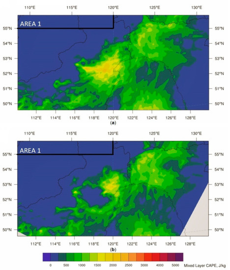 Spatial distributions of MLCAPE index within the area with intensive convection for: (a) control experiment and (b) ART experiment.