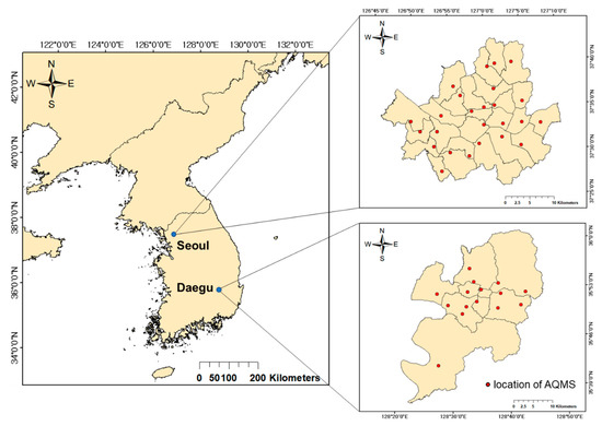 Location of Seoul and Daegu in Korea. Red dots present the location of air quality monitoring stations (AQMS). This map was produced by using ArcMap 10.6 of ArcGIS software.