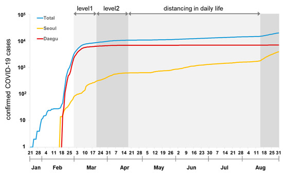 The novel coronavirus (COVID-19), which was first reported in Wuhan on December 31, 2019, is spreading rapidly around the world and was declared a pandemic by the World Health Organization (WHO) in March 2020 [1]. In Korea, the first confirmed COVID-19 case was reported on January 20, 2020, and the number of confirmed COVID-19 cases began to explode around Seoul and Daegu, reaching 19,947 cases by 31 August 2020.