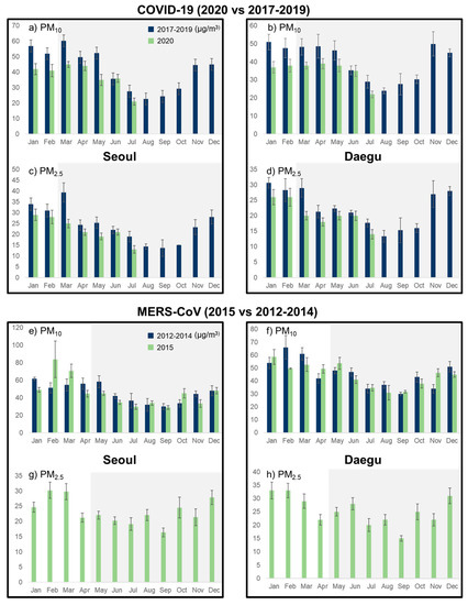 Figure 3 represents the change in the concentrations of atmospheric PM in COVID-19 and MERS-CoV in the current year compared to the previous three years. Since March, when social distancing due to COVID-19 began, PM2.5 and PM10 have seen significant declines in both Seoul and Daegu compared to the previous three years (excluding June). The average concentration of PM10 in Seoul in March was significantly reduced from 60.3 μg/m3 over the previous three years to 45.0 μg/m3 in 2020 (Figure 3a). In Daegu, it was significantly reduced from 48.3 μg/m3 to 38.4 μg/m3 (Figure 3b), showing 25.4% and 21.4% rate reductions in Seoul and Daegu, respectively.