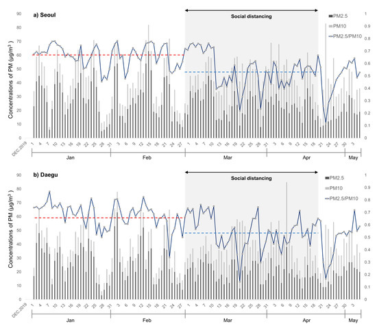 The PM2.5/PM10 ratios decreased from 0.66 to 0.54 and from 0.68 to 0.54 in Seoul and Daegu (Figure 4a,b), respectively, shortly after the implementation of social distancing. Even if the PM2.5/PM10 ratio is affected by spatio-temporal variables, this significant reduction in the ratio can be explained by a decrease in anthropogenic emissions after social distancing. After social distancing, the average traffic volume decreased by more than 30% in the first week of March, mainly in the metropolitan area. In particular, from the end of February when the number of confirmed cases exploded in Daegu, the total traffic volume including public transportation decreased by up to 69% [30].