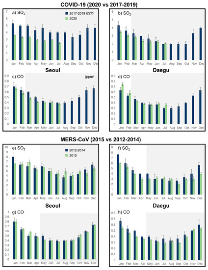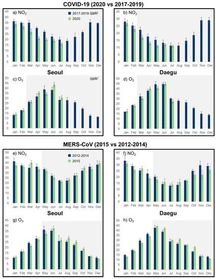 Meanwhile, no significant changes in the year-by-year concentrations of gaseous pollutants were observed in the two cities (Figure 5e–h, Figure 6e–h) because there was no marked change in human activity, including the operation of industrial facilities or traffic volume, since the MERS-CoV outbreak.