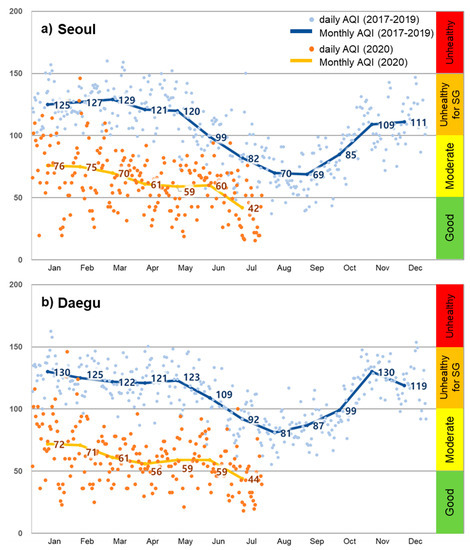 Comparison of daily and monthly air quality index (AQI) between 2020 and the previous three years ((a) Seoul, (b) Daegu). Categories of the AQI are “good” (green, 0–50), “moderate” (yellow, 51–100), “unhealthy for sensitive groups (SG)” (orange, 101–150), and “unhealthy” (red, 151–200). “Very unhealthy” (purple, 201-300) and “hazardous” (maroon, 301–500) were not observed in this study.