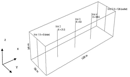 The 3D computational domain considered in this work is shown in Figure 1 and its dimensions are as follows: Length (x-direction)—126 m, width (y-direction)—36 m, and height (z-direction)—36 m. The locations where the vertical profiles of the three parameters (streamwise velocity, u; turbulent kinetic energy, k; and turbulent dissipation rate, ε) were compared against the inlet profile at L1 are also shown in Figure 1. The initial conditions for the parameters of interest (u; turbulent kinetic energy, k; and turbulent dissipation rate, ε) were based on the their values for the inlet conditions, i.e., the computational domain was initialized using the inlet values of these three parameters, whilst pressure was initialized to the atmospheric pressure value.
