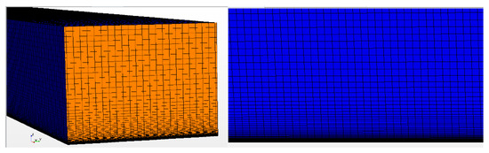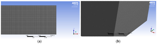 The computational domain meshed using equidistant structured mesh in both the Fluent and CFX simulations: (a) the full 3D computational domain and (b) a horizontal (x-y) plane with the computational, structured, hexahedral mesh.