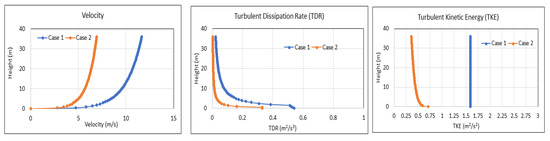 For Case 1, the turbulent kinetic energy was set to a constant value of 1.54133 m2/s2. For Case 2, the inlet profiles were based on the expressions shown in Table 2 [29], with the values of the constants being: . For Case 3, the inlet profiles for all parameters, i.e., streamwise velocity (, TDR ( and TKE ( were based on the outlet values from Case 2. The resulting inlet profiles for Cases 1 and 2 are shown in Figure 5.