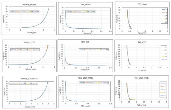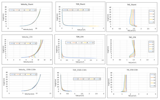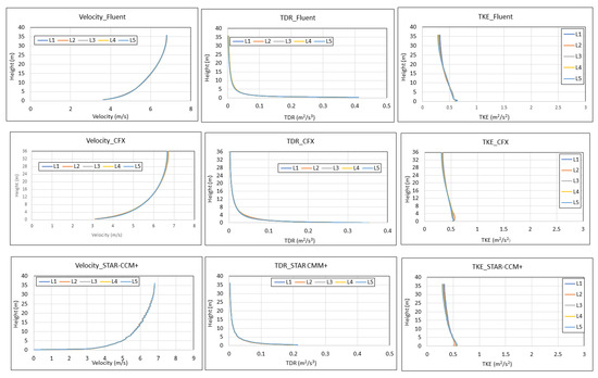 From Figure 13, it can be seen the vertical profiles for the three parameters (u, TKE, and TDR) are well-preserved, with small variations, whilst Figure 14 compares the mean variations for each parameter using the three software.
