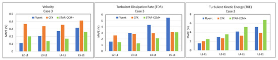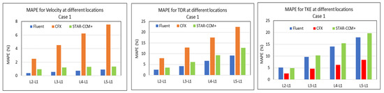 It is interesting again to see, from Figure 14, that the lowest MAPE values for the velocity (0.25%) and TDR (3%) profiles are obtained from the STAR-CCM+ software (except for the L1 location), followed by Fluent, with mean variations close to 0.3% for the velocity profile and 5.5% for TDR. The CFX software result in 0.4% variations for the velocity profile and 3% for the TDR profile, with the lowest TKE variations (less than 4%) (again, except for the L1 location). STAR-CCM+ results in the highest variation value—close to 7%—followed by the Fluent results reaching 5%.