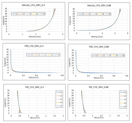 - Case 2 exhibits a good HHABL profile for all three software. For Case 2, the best overall performance for the velocity profiles appears to be with the STAR-CCM+ software, where the location-averaged MAPEs are less than 0.5% and, also, have the lowest SDs (<1%). For the TDR profiles, STAR-CC+ results in the lowest location-averaged MAPE value of 4.22%, with a similar value by the Fluent software, but STAR-CCM+ appears to have a higher SD (7%), as opposed to the ~5% of SD using Fluent. The CFX software results in the slightly higher location-averaged value of the MAPE (5.95%) and the highest corresponding SD (10.1%) (Table 6). It is noted that STAR-CCM+ implements the blended wall function, and a higher resolution mesh is necessary (base cell size of 0.1 m), in combination with a relative velocity of −12 m/s and a roughness length of 0.03 m, as opposed to the roughness height Zs = 0.4 m in Fluent and Zs = 0.88 m in CFX. The differences in the TDR values between STAR-CCM+ and the other two software (ANSYS Fluent and ANSYS CFX) may be again due to the fact that, in STAR-CCM+, a two-layer k–ε realizable model was implemented, in which the TDR value in the layer near the wall was estimated using the Wolfstein expression, as opposed to the transport equation. Although the ANSYS CFX software did not perform as well as the other two software for the velocity and TDR profiles, it seemed to perform better than Fluent and STAR-CCM+ in relation to the TKE, exhibiting the lowest location-averaged values and SDs, as seen in Table 6.