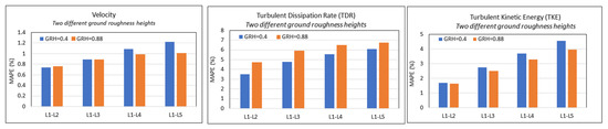 Having established the most preferred Zs value for the CFX software (Zs = 0.88 m), the results for all simulations—for the three software—were then compared and presented in Figure 11 and Figure 12. Figure 11 shows the vertical variation of the profiles for the parameters of interest (velocity, TDR, and TKE), whilst Figure 12 shows the MAPE values (Equation (1)) for each software. Visually, from Figure 11, we see all software retain the HHABL profile within the domain considerably well. Figure 12 shows a more quantitative analysis of our results, with the variations of the MAPE values for each parameter presented.