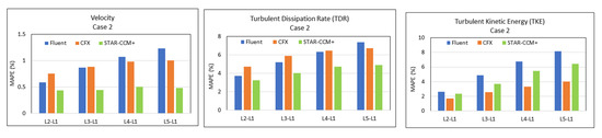 As for Case 1, we also estimated the standard deviations (SDs) for the MAPE data presented in Figure 12, as shown in Table 6. For this case, we observe a lowering of the MAPE values for all parameters—compared to Case 1—in all software simulations, with the exception of the Fluent velocity simulations, which show a slight increase (around 3%), as opposed to <1% in Case 1. The lowest MAPE values were obtained with the STAR-CCM+ simulations. As in Case 1, the SDs of the MAPE values were also estimated, and again, as in Case 1, these were of the same order as the MAPE values. For Case 2, the lowest MAPE values are obtained for the velocity parameter, using the STAR-CCM+ software. Correspondingly, the lowest SD values are also observed with the STAR-CCM+ simulation results for the velocity, with typical values of around 1%. The highest MAPE values are obtained for the TDR parameter (between 4 and 7%), with the corresponding highest SDs for the same parameter (~10% using the CFX software). It is important to note that Case 2 uses more realistic inlet conditions for all three parameters (velocity, TDR, and TKE) and appropriate wall functions/boundary conditions for the solid, bottom surface. Thus, it is not surprising that the overall results are improved, and lower MAPE values are observed, as well as lower SDs, with the exception of TDR using the CFX software.