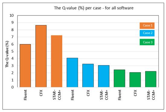 For Case 3: In this case, from both Table 8 and Figure 15, we can see that all three software result in lower Q-values and associated SDs in relation to Case 2, with overall Q-values ranging from 2.06% with the CFX results, followed by STAR-CCM+ with 2.2% and Fluent just over 2.4%. Their corresponding SDs are also of the same order, with STAR-CCM+ resulting in the lowest SD value of 1.5%, whilst Fluent results in an SD of 1.79%.