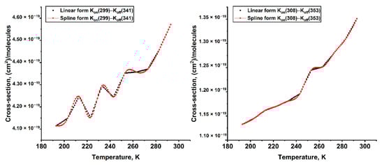 The difference in absorption cross-sections for two-wavelength pairs in the linear and spline forms is plotted in Figure 1. A set of absorption cross-sections in a linear form is used usually to retrieve ozone profiles. From Table 1 it can be seen that the absorption cross-sections are varied with the step of 10 K. This can be clearly seen on the left panel in Figure 1, which indicates the considerable variations in the cross-section difference for the wavelength pair of 299/341 nm.