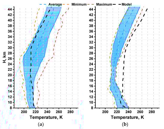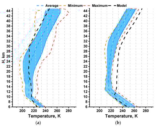 The Microwave Limb Sounder (MLS) microwave radiometer operates onboard the American scientific-research satellite Aura within the NASA (National Aeronautics and Space Administration) Earth Observing System Program. Aura is in a near-polar 705 km altitude orbit and fixed relative to the sun to give daily global coverage with about 15 orbits per day. MLS measures atmospheric constituents: H2O, OH, HO2, O3, CO, HCN, CH3CN, N2O, HNO3, HCl, HOCl, ClO, BrO, volcanic SO2, as well as the temperature and humidity profiles in the stratosphere. Our work uses standard temperature data products obtained at 118 GHz in the stratosphere and 239 GHz in the troposphere [22,23]. MLS temperature profiles are available to everyone on the NASA website [24]. The available MLS temperature profiles consist of 55 points with spatial resolution from about 1 km to several kilometers.