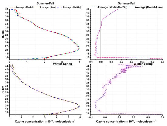 However, the average deviations have insignificant values from −0.06 × 1012 molecules × cm−3 at height of 17.4 km to 0.12 × 1012 molecules × cm−3 at 38.2 km during winter–spring season, and from −0.06 × 1012 molecules × cm−3 at height of 17.4 to 0.1 × 1012 molecules × cm−3 at 40 km during summer–fall season.