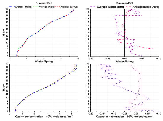 That large values are associated with the sample for separate days of observations, namely, with the altitude range of a single profile retrieved. The average deviations in the troposphere have insignificant values, from −0.22 × 1012 molecules × cm−3 at height of 20 km to 0.11 × 1012 molecules × cm−3 at 6 km during winter–spring season, and from −0.15 × 1012 molecules × cm−3 at height of 7.8 to 0.14 × 1012 molecules × cm−3 at 8 km during summer–fall season.