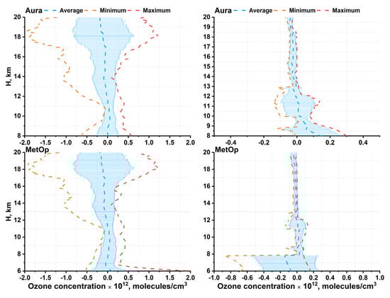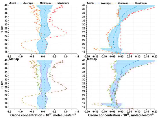 Figure 4 and Figure 5 clearly illustrate the effect of temperature correction, carried out using meteorological data from Aura/MetOp satellites and IAO model of temperature, as well as the difference, in absolute values, between average OVDs over all days of measurements, retrieved using model meteorological parameters (“Model”) [32] and satellite data. The difference is denoted as “Model-MetOp” and “Model-Aura”. The discrepancies or differences between average ozone profiles, retrieved using temperature model and satellite data, are about the same. However, due to the shortage of measurements in summer–fall period according to the used data from work [7], these differences were more marked.