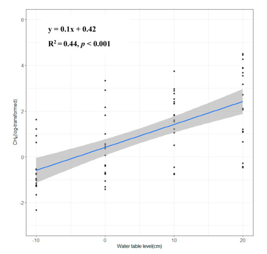 Relationships between water table levels and CH4 emissions; x represents the water table level and y represents the log-transformed CH4 emissions. The blue line and grey region indicate the regression line and 95% confidence interval, respectively.