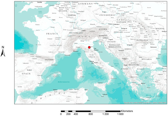 Map showing the location of the city of Bologna in Italy (red dot) (source: Esri, Garmin, USGS -United States Geological Survey-, NPS-National Park Service-).