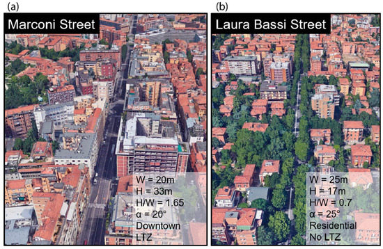 Street canyons views and details (W = mean street width, H = mean street height, α = orientation angle of the street canyon with respect to the meteorological north, LTZ = Limited Traffic Zone) of the two street canyons in Bologna: (a) Marconi St.; (b) Laura Bassi St. (source: Google Earth).
